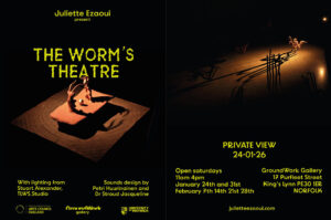 I was commissioned to compose music for The Worm’s Theatre, an installation by artist Juliette Ezaoui, presented at GroundWork Gallery in Norfolk in January 2026. The work explores the hidden life of soil and human affect on the delicate subterranean ecosystem. By responding to Ezaoui’s concept and visual language, I sought to reimagine this sensuous world through sound.
